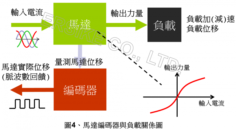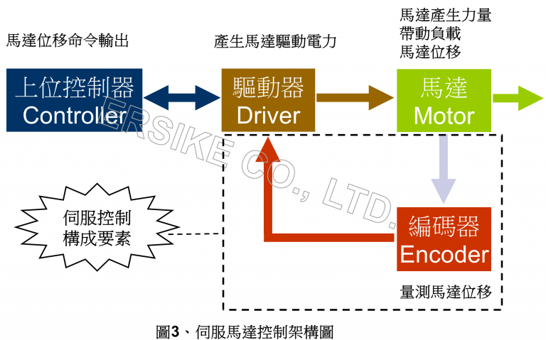 圖3為伺服馬達控制架構圖,典型的伺服馬達控制由四個功能色塊所組成,分別為馬達(綠色)、編碼器(紅色)、驅動器(棕色)、上位控制器(藍色),其中編碼器是伺服控制構成要素,有它才存在 “伺服”或“閉回路”的控制。