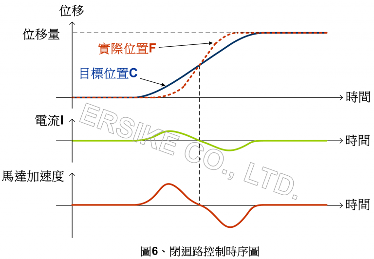 閉迴路控制的慢動作過程就如下方時序圖6,當目標位置C大於實際位置F時,驅動器提供前進電流給馬達,此時馬達加速前進,當馬達跑過頭也就是目標位置C小於實際位置F時,驅動器提供後退電流給馬達,此時馬達開始減速,在不斷的加速與減速控制過程中,直到實際位置F等於目標位置C時,驅動器停止提供電流給馬達,期間加速或減速的力道取決於閉迴路控制的參數,當然也與目標位置C和實際位置F的誤差大小相關,誤差過大落後太多就如同開車般,油門給他用力踩下去。