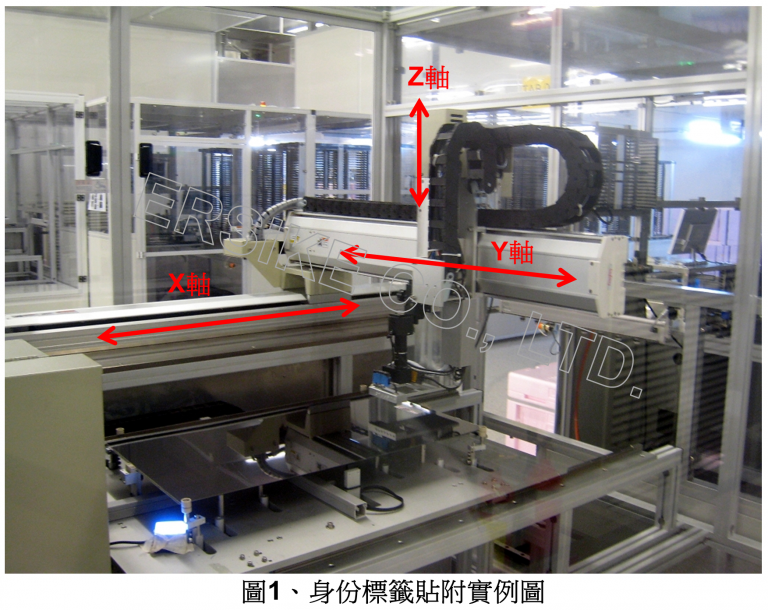 小編帶各位看看兩個應用實例,第一個例子為產品身份標籤自動貼附設備,圖1三軸(XYZ)直交式機械手由伺服馬達驅動,可輕易在短時間內完成取標籤及貼標籤動作,這是一個3度空間移載結構的典型設計,適合在不複雜的工作區域中固定路徑移載。
