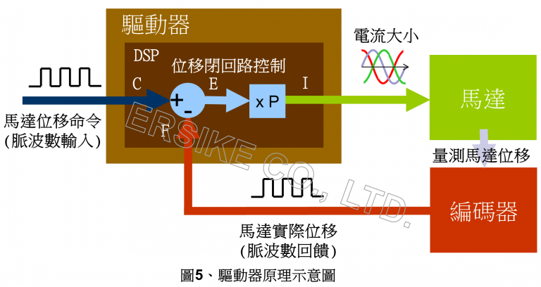 驅動器是伺服馬達控制的核心,也可以說是伺服馬達的主人,要讓馬達乖乖聽話做好事來,就需要跟他的主人維持良好互動了。圖5驅動器接收來至外部的馬達位移命令(目標位置),命令傳達形式可以是典型的脈波數輸入,也可以是較高階的通訊協議,同時驅動器也由編碼器取得馬達實際的位移,在即時的位移監視中得知馬達實際位置,有了目標位置與實際位置,接下來就由驅動器內部的數位訊號微處理器(DSP),專注執行著閉迴路控制(淺藍色x P符號),使得馬達很有效率的到達指定位置。