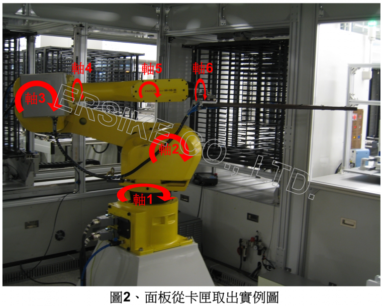 第二個例子為液晶面板自動投入產線的設備,圖2為六軸關節型機械手,每個關節皆由伺服馬達傳動,可以快速的將液晶面板從卡匣站取出後投入產線生產,因為機械手的多關節特性,且每個關節協調同動著,容易在空間中執行多樣化的移載路徑,彷彿像是鋼鐵人的巧手般,可以在複雜的空間中高速且順暢的移動著巨大物體,賣力聽話又不會輕易罷工,在未來的智慧製造中擔任重要角色,關於六軸關節型機械手的介紹,先賣個關子再找機會與各位分享心得。(事實上是文筆不好,腦子裡的東西要轉化為文字,過程是煎熬且漫長,原諒我這個理工人…XD)。